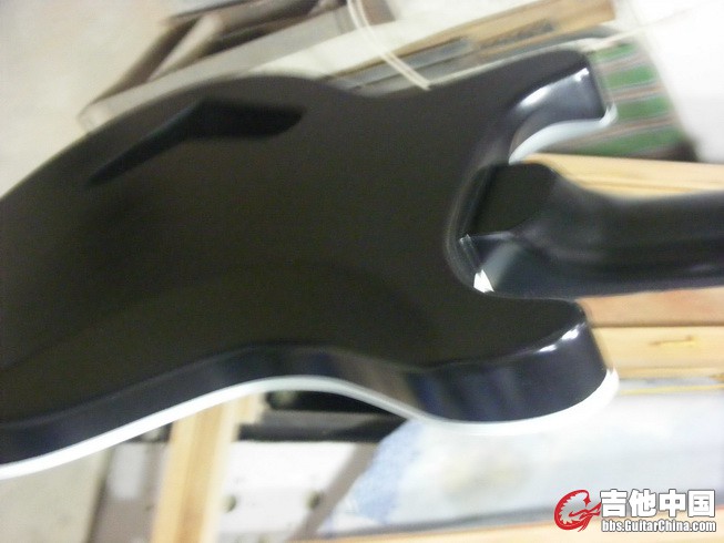 没有用华丽的枫木贴面,,只好自己鼓捣了一个简单的贴面,。粗加工都是那么回事,就没有拍过程了。都是在地下室完成,对这把琴的漆面要求不高,所以喷漆没有去找专门的喷漆房,,黑色的琴显不出尘点。