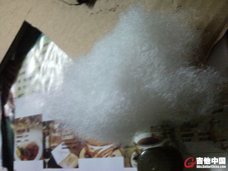 很多人的吉他,玫瑰木指板上得缝隙里都有那种白色的灰,用邓禄普的清洁准备剂加上清洁剂也除不掉。