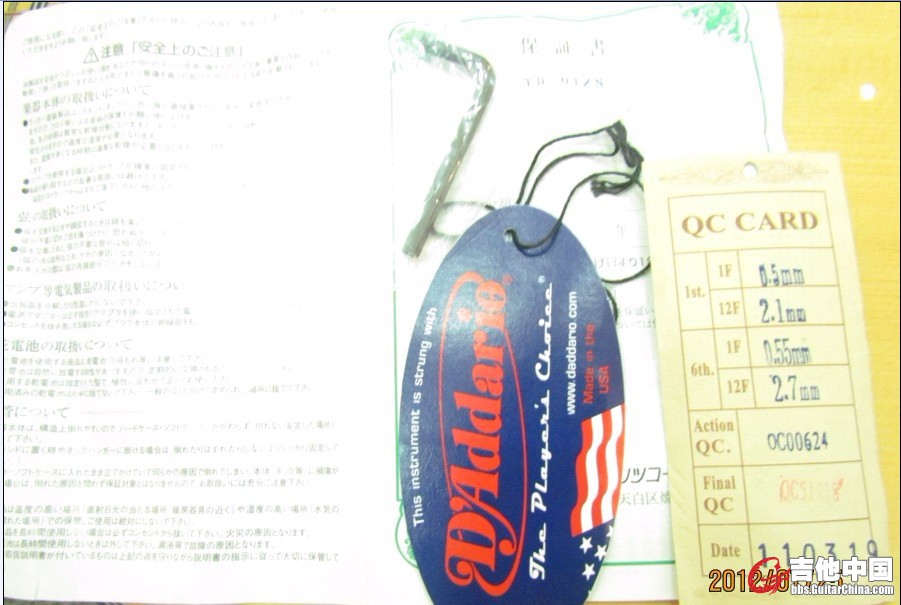 2.这把琴在日本售价仅为16800---19000日元,人民币1300左右。如果是假琴,我认为做这个型号假琴的人太傻,把日文说明书,正规出厂掉牌(还标弦距),甚至琴头背后的小标签MADE IN CHINA,把这些细节全部仿得和日本销售的YD-01一模一样。那我估计这个成本算下来,费这么大心还赚不了多少钱。
