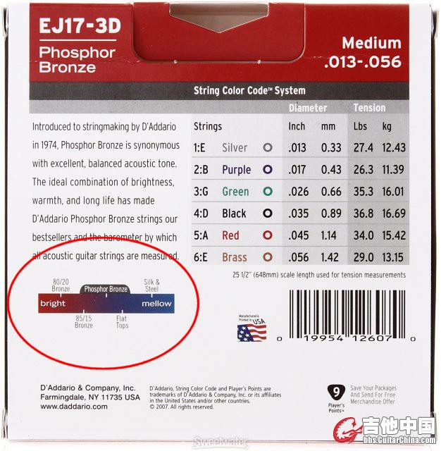 想高频好一点就用黄铜弦吧 (Bronze 80/20).(达达弦的包装背后有一个材料比较图)