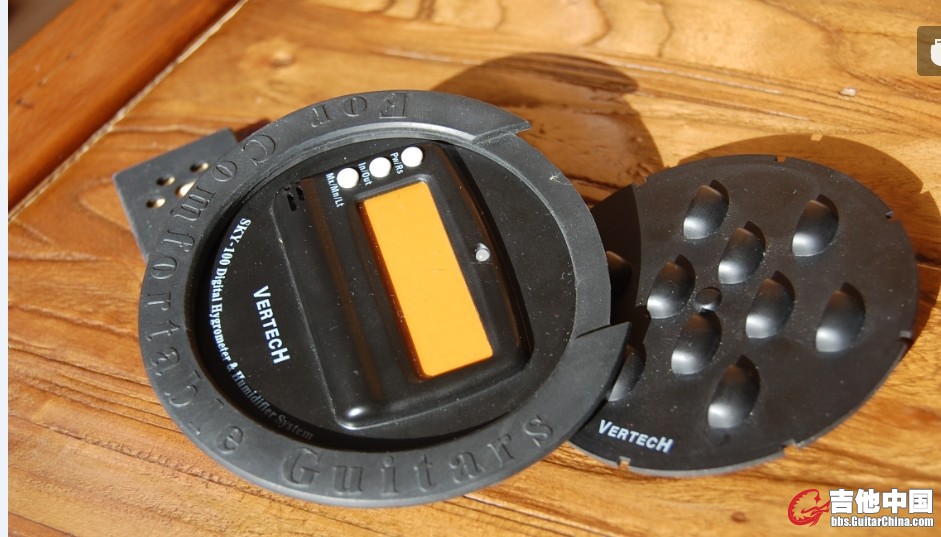 目前市场上功能最齐全的吉他加湿器就数韩国VERTECH公司发明的叫Hygrometer and humidifier System SKY-100吉他专用加湿器/防潮器(品牌:VERTECH,SKY-100);这款加湿器配置了内外湿度计,环境温度计,加湿器,还配带音孔声音控制器。