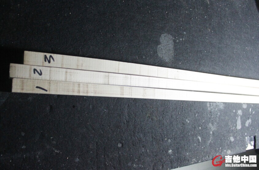 图中是3拼的一个示意小块,应该算是径切常见的几种纹理了。因为即使同种木材的生长密度也有稍许差别,所以呈现的纹理也不同。第一条和第二条算是密度相对较大的,理论上强度也更好。在说回来,说的有点乱,见谅。没有查找到相关的资料文献,英语水平也很有限,国外的资料也没查到。所以只说一下我个人的看法,影响琴颈强度和稳定性的原因很多,比如木材品种,干燥程度,制作工艺等等。抛开这些先不讨论,先说一下贝司最常见的枫木琴颈吧(单片式),在同等制作条件等等的情况下,理论上径切的强度和稳定性是要大于普通切割的,个人觉得是因为纹理更为均匀,质地更紧密,纤维方向统一的原因。曾经见过一根径切的贝司琴颈料,但是当时没拍照,所以也没有单片式径切料琴颈的实物,很抱歉。而且一直没有机会实际制作一根径切的琴颈和非径切的琴颈,在同等存在条件存放下的对比强度和稳定性试验,要提上日程,亲身试验一下,所以这里没法提供有效的数据证明具体稳定性要好多少,各位开骂吧!如果哪有朋友有这样两根琴颈的话欢迎提供一些数据。说这些的目的就是希望能给选购琴的朋友提供一些小小的帮助,可以捎带着注意一些琴颈木材上面的区别。