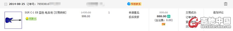 但是跑过来电脑这边要买了我还是冷静了下,认真的查了下这琴的评价神马的,网上都说国产新手琴SGR C1是很不错的,我又想就一千块钱,还要要求神马呢,只要不是山寨货应该不会有问题的...再一搜网上对这家琴行的评价更是不得了,任何负面评价都没有,评价都是充满了正能量...当时脑袋一热也不管了,直接就拍了。临付款的时候看网友说在网上买琴不靠谱之类的,但是看大家对这琴行的评论我觉得应该不会有问题,而且这琴行还是吉他中国论坛推荐的,我更不怀疑了,我只是用网页版的旺旺问了下卖家,因为我买东西一般不退货,也不讲价,看好的觉得行就买,不行就不买,都是直接拍了付款,但是因为这把琴让我感觉真是了却了自己一个愿望,很激动,也有点担心,就问卖家,卖家说,保证全新正品,我问他为什么比别人便宜这么多呢,他说搞活动,数量有限,卖完为止,让我不用担心,放心拍就行了...因为当时我用的网页版旺旺没有聊天记录,但是他肯定是有得,我可以以我人格为担保,以一个有医德的牙医为担保,此帖句句属实!鉴于网上的一致好评,和吉他中国论坛的推荐,我就再没犹豫,付款了,他说不要送的东西的话裸琴888,我就什么都没要,只要的裸琴,带的原厂琴包,还有扳手...说实在的,琴包挺烂...不过我还是挺珍惜的,毕竟自己心爱滴东西...