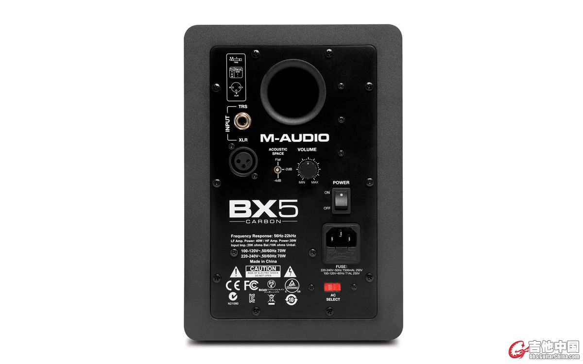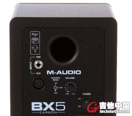 背部接口 XLR 和 TRS 平衡输入,内置功放功率为 70W ,大功率无噪音,使你能轻松监听现今的现代音乐。在任何环境下,它都表现出了 M-Audio 的优越品质。另外, BX5 的旋钮属于被动式放大,扭到 MAX 即为 UNITY GAIN ,不能增益只能衰减,这一功放设计实际上也有利于控制底噪。