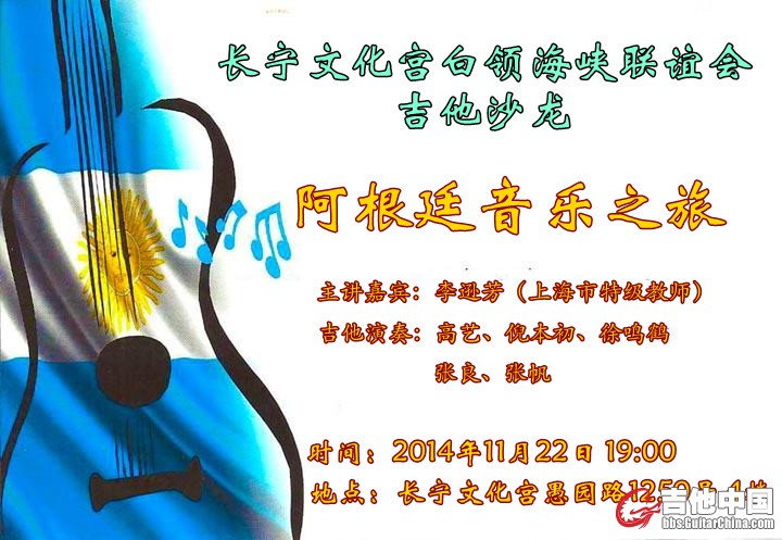 活动介绍: 本次白领海峡联谊会吉他沙龙将邀请李逊芳老师以她阿根廷异域文化实地探险考察,音乐采风所见所闻为大家做精彩讲座。同时,上海最杰出的吉他演奏家高艺、倪本初、徐鸣鹤、张良、张帆等老师将为大家倾情演奏皮亚佐拉、普霍尔、萨格拉雷斯、卡多索等阿根廷作曲家的精彩作品。