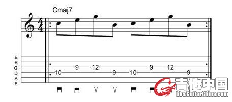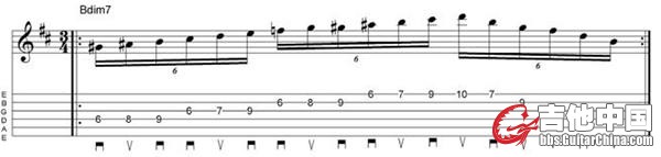 接下来的五条练习则是一些常见扫拨方式的处理,其中包括了Malmsteen风格的三连音、Gambale风格的扫拨——其中采用两了根弦上五声音阶扫拨以及一些“经济型”拨弦方式。这些都是在一个把一个和弦的基础之上来完成的,因此你可以将自己的精力全放在扫拨技巧的掌握上,直到你成为这一技术的大师。当然,如果你有更多精力的话,不妨在其他的各种不同把位、音阶下来进行练习。