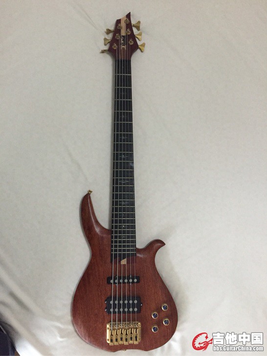 国内手工6弦贝斯,木材做工一流,懂行的可以看看,一整块球纹花梨木琴体,喜欢自己DIY琴的朋友都知道,球纹花梨木很难买,而且这么大块的更难,琴这个价位基本是卖木材。琴颈应该是紫心木加虎枫,乌木指板,琴头最尖的地方木头磕裂了一小片,还没掉下来,有木胶的朋友粘一下,此琴仅此一处瑕疵。电路和拾音器说实话,一般,被动的,有意收藏的朋友可以换一套。金属配件用的都很不错。