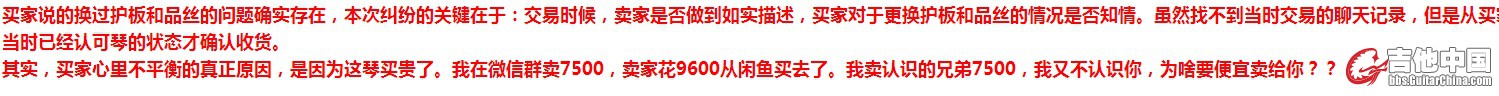 卖家鲍峰 你的原话。 “买家当时买这把琴 目的肯定不是自用。整个交易过程买家都在不停的重复强调自己用。” 自己用还要需要强调 。 你把我当白痴 可以。 别把全GC当白痴。那琴我不是自己用 我送人?? 翻来覆去说自用 说明我不是二道贩子。这个道理很复杂??
