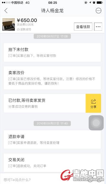 我倒不是非要买,而且买卖自由,只是卖家这样直接关闭交易,删除qq的行为我真是有点气愤,我感觉这样做连起码的道德都没有了,就因为一张绿色的毛爷爷便把自己的人格践踏了,看资料,卖家还是做琴行的,如果连这点儿信誉都保证不了,我感觉你自己应该思考一下。
