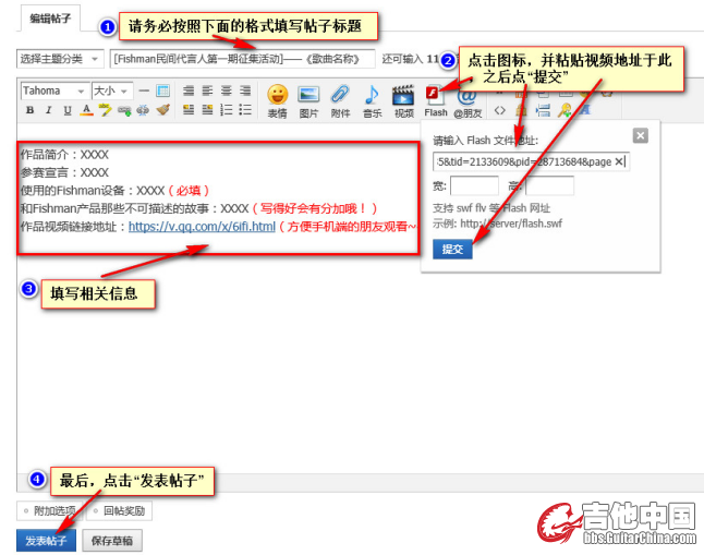 3.发帖:把作品以帖子形式发布到吉他中国论坛(参考:本文最后的《发帖要求及教程》)