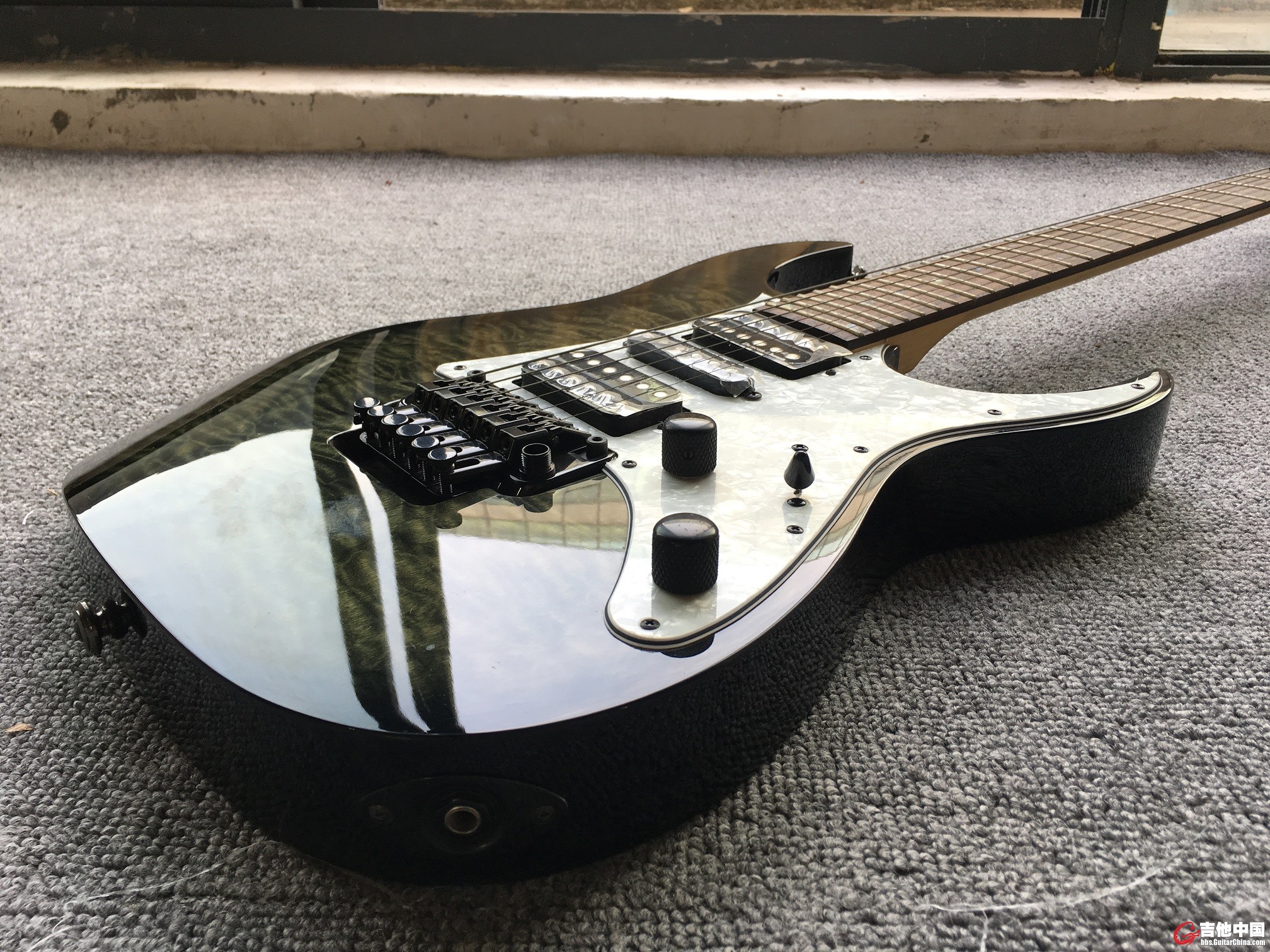Ibanez RG系列12年左右试产型号,全高配,可参考RG652等。沼泽岑木琴体、水波纹枫木面板、北美硬枫琴颈、玫瑰木指板、鲍鱼贝镶嵌,双单双Ibanez定制邓肯拾音器、一代Edge零点颤音琴桥。