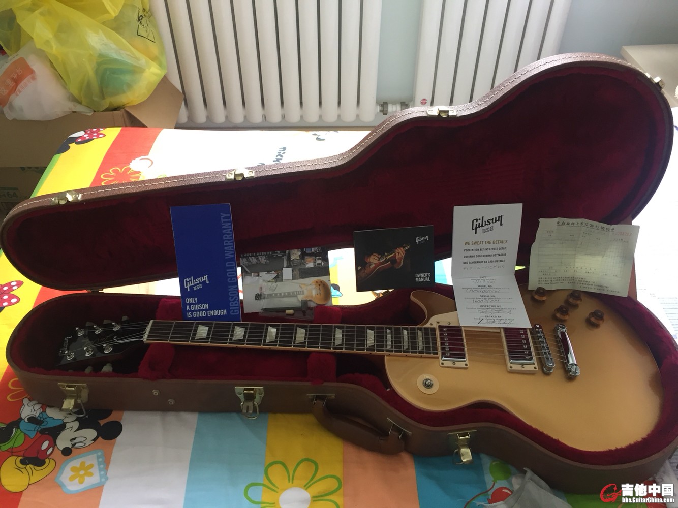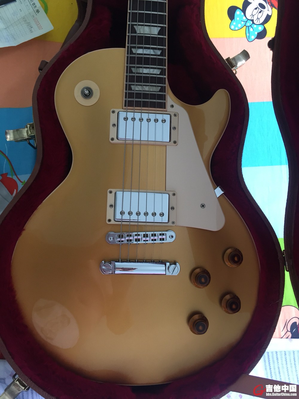 gibson lp std(大金面)2016款 9.5新 因升级了r系,所以卖了,本人2016年5月30日购买于北京旋转七天(下图有收据照片)满打满算刚刚两年,因本人工作忙,很少弹,琴很新,就是屁股处有一点点小磕碰(都没掉漆,下图中有照片),品丝很新,钢筋没调过,余量充足,琴平时都在恒湿箱里侍候(下图有照片),本人保养得非常好,都是爱琴之人,琴就像自己的孩子。旋钮升级为原厂玉石(原厂旋钮没办法给你了,以出售),钟盖因为有裂痕,换了原厂无字钟盖(原套的钟盖也一起给你拿走),价格为包邮价(顺风空运加保价)支持本地自提,外地买家可以视频看货(随便看,想怎么看怎么看)哈哈,实在人,有需要的联系我电话(微信)18704258895