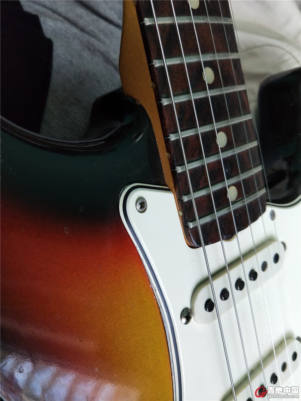 | 1969 | 琴颈底部印章,前边是琴型号代码 09-strat | 枫木或玫瑰木 | 大头,全黑大字 | 黑塑点或者白塑料点 | 大写F卷弦器 | 琴颈底部十字调节, | 带有Flogo 250000-280000 | 3孔的琴颈连接,年月 在中间拾音器下或者弹簧下 hardtail(意思是没有摇把的)肯定在中间拾音器 铅笔写 月-年 | ash body 56年中期换成alder凯姆木。(除非是原木色肯定用ash body) | 换成厚漆,只会掉块的,再没有古典的旧感了。 | Fender Pat. Pend.钢印(注意不是正反两个fender) | 灰色底至少有一个或多个有写日期的。 | 材料,孔位发生变化了 | 137 +2位年份+2位周数 | 细微调整是中间是白色塑料 |