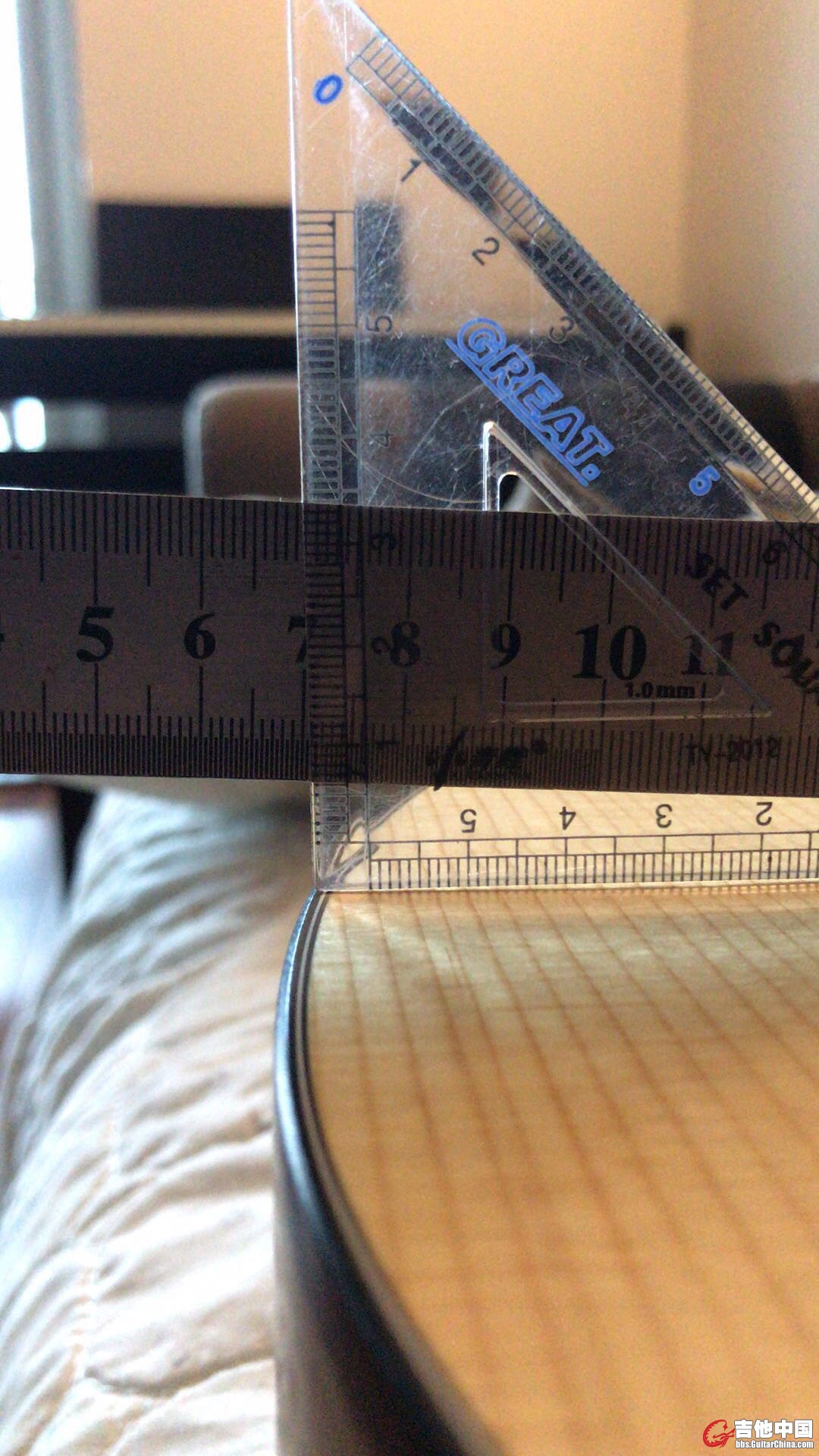 slash8293 发表于 2019-1-10 09:42 琴放平,找一块长点的直尺,靠在琴桥上,然后按压直尺一端,量另外一端距离面板的高度,我泰勒114,距离12c ...