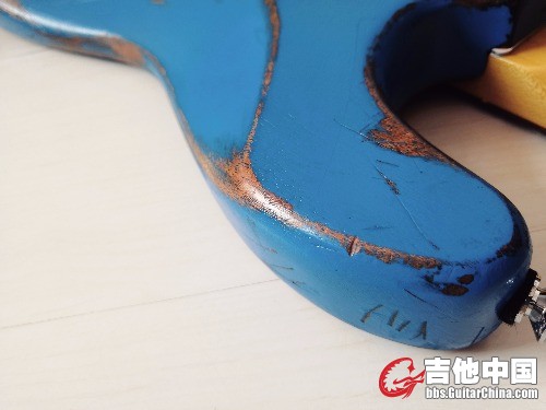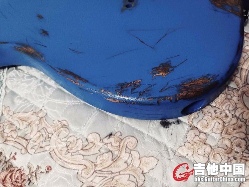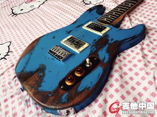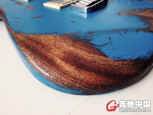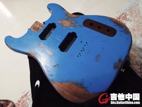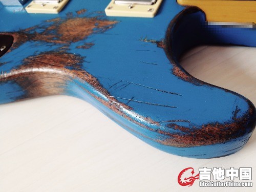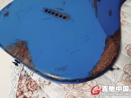 很快 ,在一家淘宝海外木材代购处选了一套对拼的非洲桃花芯木料,对!是木料,长方形,之所以选桃花芯是来自于多年来我对桃花芯音色的喜爱,紧接着找了一家惠州的厂子联系加工细节(ST型,双双拾音器开槽,固定琴桥,穿弦式设计)然后发货 等待 两周后 ,发去的木料变成了我想要的样子并邮寄回来,可以动手了!我早已提前购买了蓝色硝基漆,和小型喷漆灌,调色和比例后。罐装 开喷,经过十次左右喷涂,油漆干燥速度也很快,这是硝基的特点,又放了几天味儿 开干!我用挫刀,小凿子和粗砂纸 铅笔对琴体进行做旧,因为没有经验,我先考虑琴可能出现大范围脱漆的位置 用铅笔画线 ,可能出现磕碰的地方 进行标记 还有大的划痕 就这样用了半天 搞成了现在的样子 。