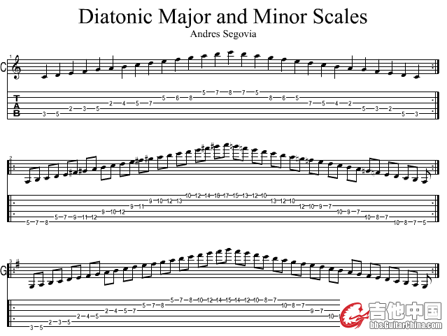 塞戈维亚24个大小调的全音阶练习,这里参考视频中的左手指法 只是一种可供参照的安排方法,这些音阶练习中的有些调式左手指法是相似的(只是把位不同),右手可以使用各种组合以及拨弦方法进行练习,比如右手任何两拨弦手指的交替靠弦/不靠比弦组合,三手指的靠弦/不靠弦组合;各种时值组合,比如:附点/三连音/五连音等等。 通过悉心地练习可以解决的常见的问题以及能够养成的技巧: