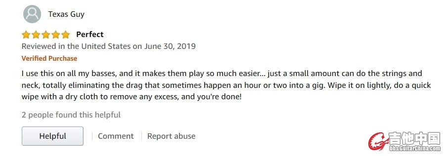 用户:Texas Guy 时间:2019.6.30,美国 完美的护理油 我所有的贝斯都用斧头鸭护理,它让弹奏变得更加轻松。只要几滴就可以擦完琴弦和琴颈,完全消除了阻力,弹奏起来非常顺畅。只要滴两滴,用干布快速擦掉多余的部分就完事啦!