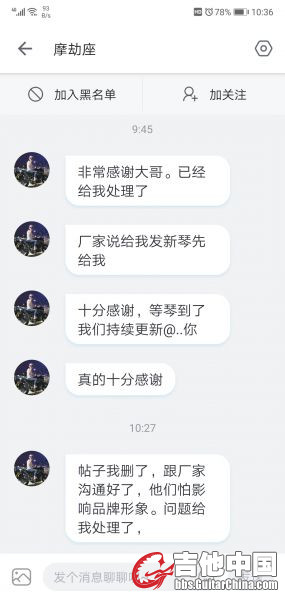 兵吉他 发表于 2021-10-19 09:22 昨天在高铁上,厂家的回复: 先生您好,您在吉他中国论坛上反映的吉他弦线偏位的问题,管理员已经把您的意 ...